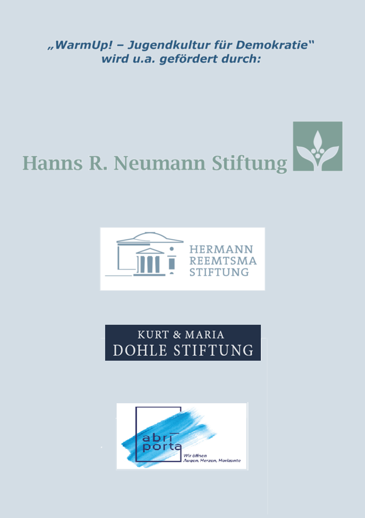 Die Initiative „WarmUp! – Jugendkultur für Demokratie“ der Mecklenburger AnStiftung unterstützt vorrangig Regional- und Gesamtschulen aus ganz Mecklenburg-Vorpommern bei der Durchführung von Projektangeboten der demokratischen, kulturellen, persönlichen und sozialen Bildung.